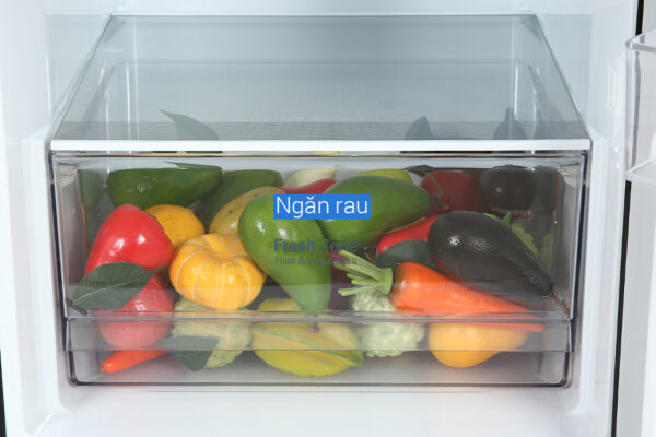 Ngăn rau quả được thiết kế khép kín, kết hợp lưới mắt cáo, hơi ẩm thoát ra từ thực phẩm được ngưng tụ lại trên lưới giúp cân bằng độ ẩm và tối ưu hoá mức nhiệt độ, giữ rau quả luôn tươi ngon.